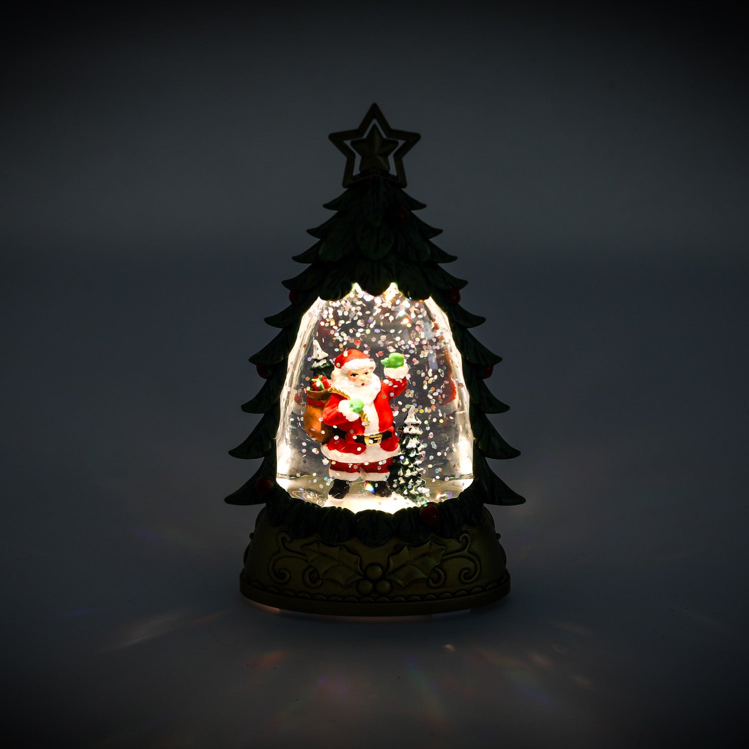 Haz brillar tus espacios esta Navidad con este adorno iluminado de Santa dentro de un árbol navideño, con efecto de nieve y luz interna. Fabricado en plástico resistente, tiene un diseño en 3D con forma de pino decorado, estrella en la punta, base con relieve dorado y un Santa sonriente en su interior rodeado de copos de nieve.